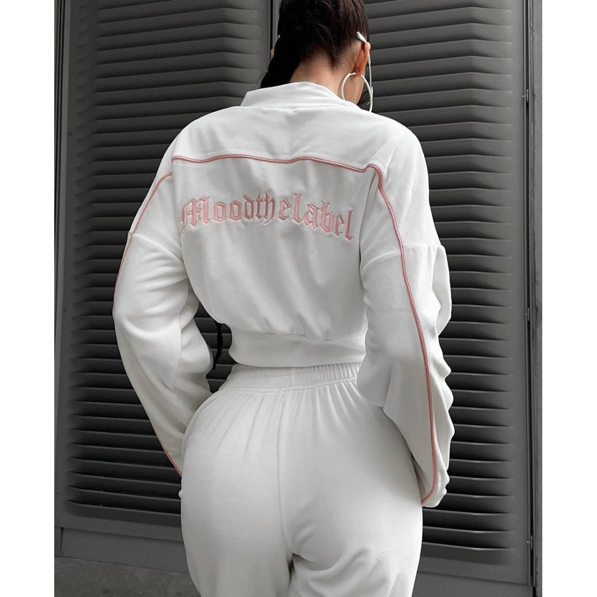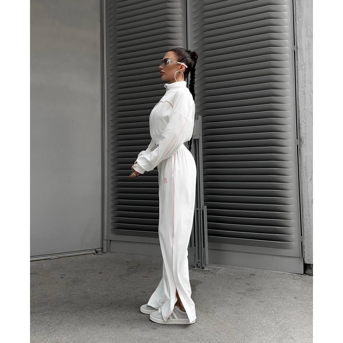 Костюм включає вкорочену кофту, яка акцентує увагу на талії та створює сучасний і стильний силует. Подвійна змійка дає змогу регулювати застібку як зверху, так і знизу, додаючи функціональності та стильності.