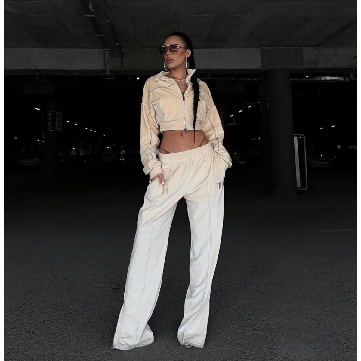 Костюм включає вкорочену кофту, яка акцентує увагу на талії та створює сучасний і стильний силует. Подвійна змійка дає змогу регулювати застібку як зверху, так і знизу, додаючи функціональності та стильності.