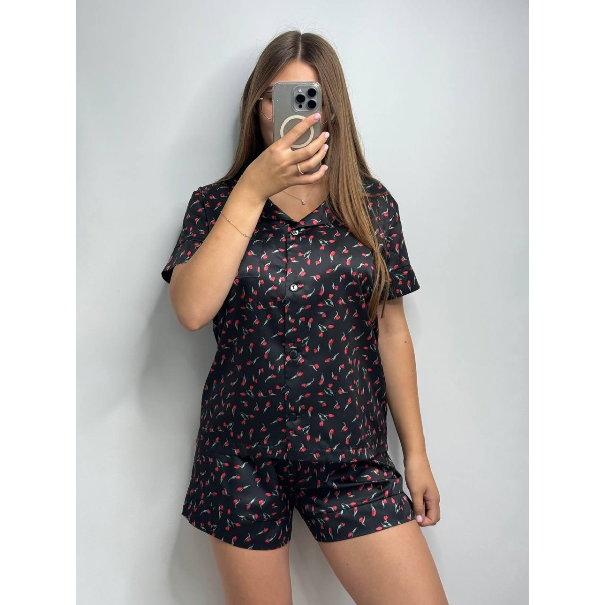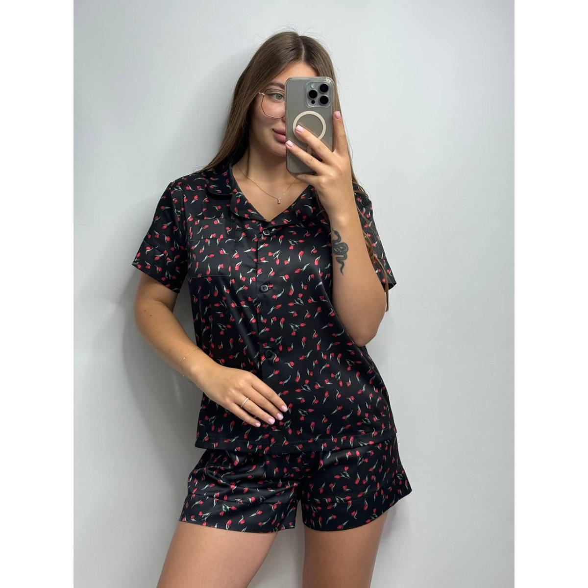 Жіноча сатинова піжама (шорти та сорочка) Елегантна і легка жіноча піжама з сатину подарує вам комфорт і вишуканий стиль. Комплект складається з шортів і сорочки на ґудзиках, що ідеально підходять для затишного сну і розслабленого відпочинку вдома. Матеріал: Ніжний сатин надає піжамі гладкості та легкого блиску, створюючи відчуття м“якості та розкоші на шкірі. Сорочка: Класичний крій із ґудзиками спереду, що додає витонченості та зручності. Шорти: Вільний фасон для максимального комфорту, на зав“язках і прошитою гумкою. Ця сатинова піжама - ідеальне поєднання стилю і комфорту для вашого нічного гардероба.