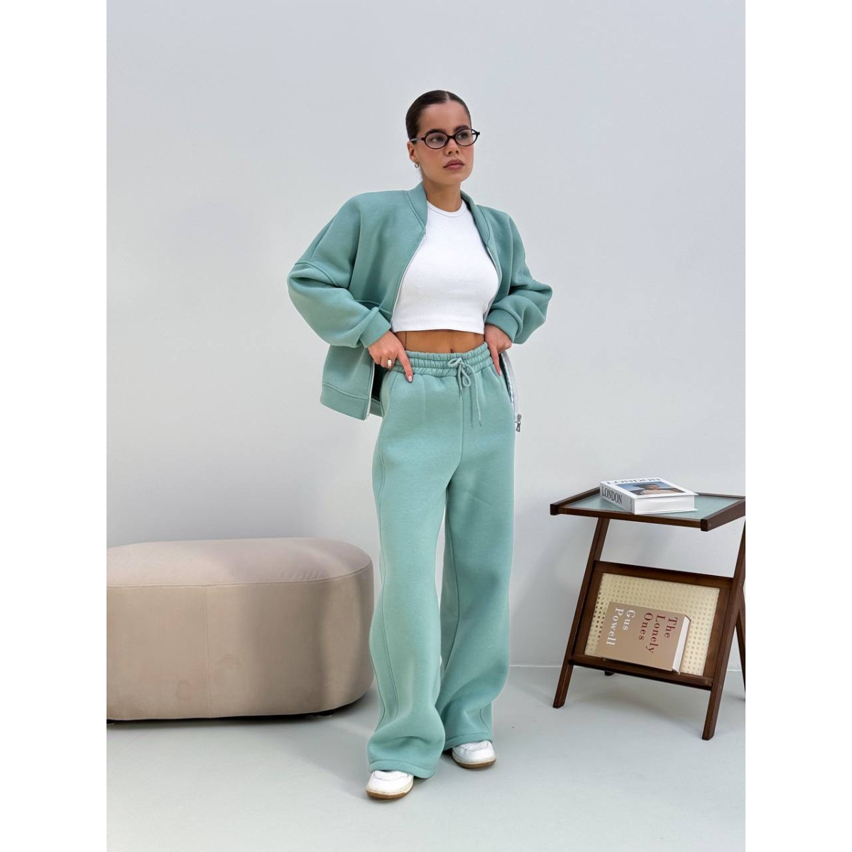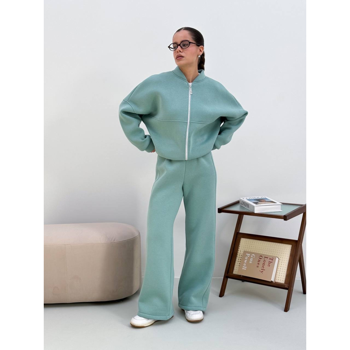 Жіночий теплий костюм-двійка з широкими штанами Оливка 42/46