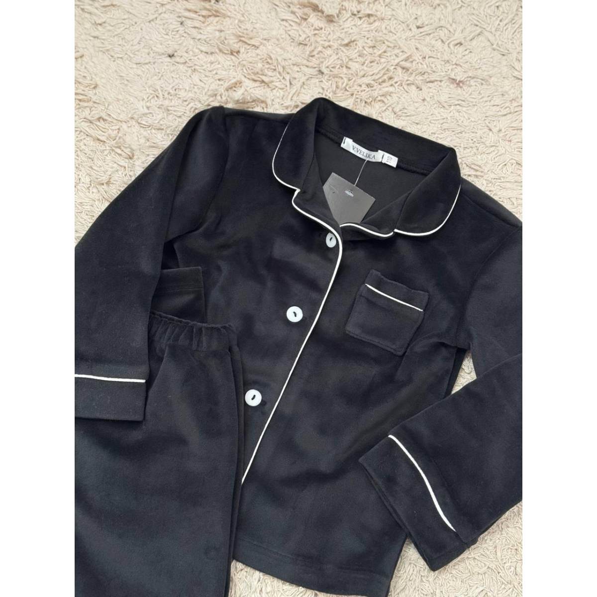 Піжама з плюшевого велюру приємна до тіла, добре тримає тепло та дозволяє шкірі дихати. Завдяки лаконічному дизайну та акуратній кишеньці комплект виглядає стильно та охайно.