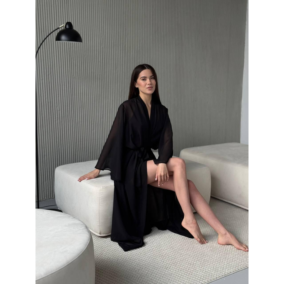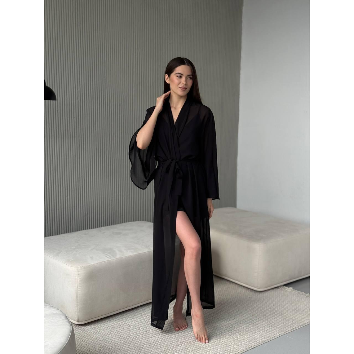 Елегантний і легкий довгий халат з шифону, який стане ідеальним доповненням до вашого гардеробу. Цей халат підкреслить вашу жіночність і створить відчуття затишку і розкоші. Ідеальний для дому, спа-процедур або в якості пляжного вбрання.