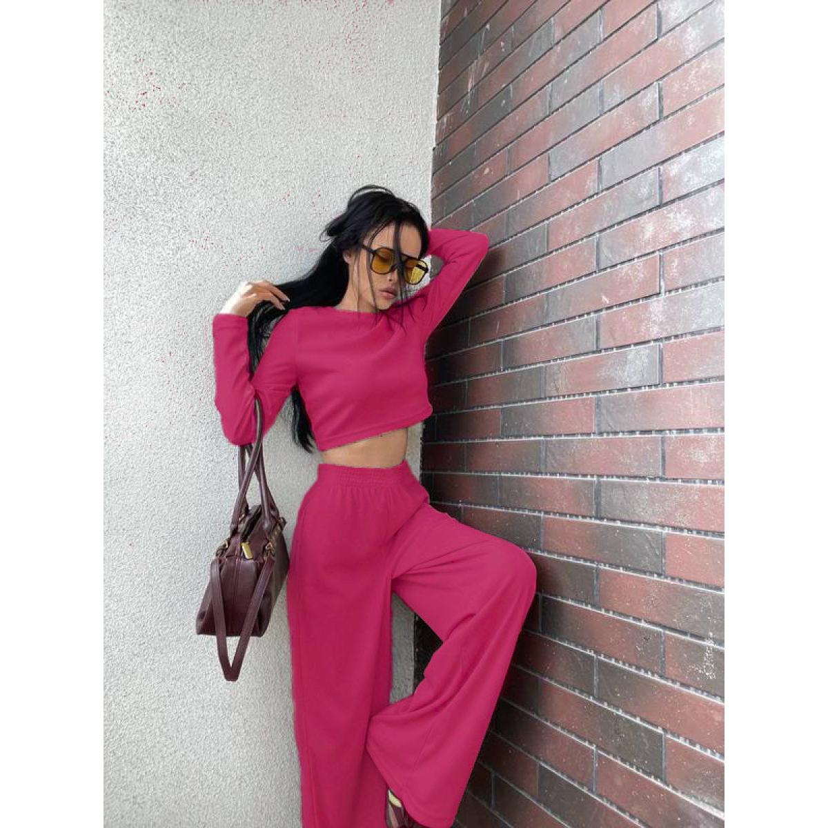 Модний і зручний жіночий костюм з високоякісного рубчика ідеально підійде для активного відпочинку та повсякденного носіння. Легка й еластична тканина не тільки комфортна в носінні, а й дає змогу шкірі дихати. У комплект входить стильний лонгслів з довгим рукавом, який не обтягує тіло, і вільні штани зі зручною посадкою, що створюють розслаблений і сучасний силует.