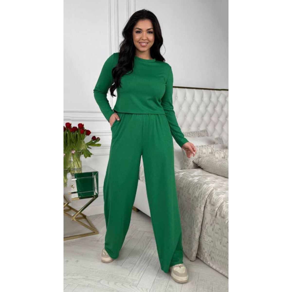 Модний і зручний жіночий костюм з високоякісного рубчика ідеально підійде для активного відпочинку та повсякденного носіння. Легка й еластична тканина не тільки комфортна в носінні, а й дає змогу шкірі дихати. У комплект входить стильний лонгслів з довгим рукавом, який не обтягує тіло, і вільні штани зі зручною посадкою, що створюють розслаблений і сучасний силует.