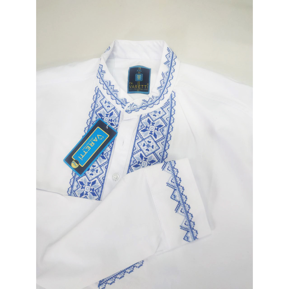 Ця чоловіча вишиванка виконана в класичному стилі з сучасними деталями. Насичений орнамент з українськими народними візерунками нанесено якісною машинною вишивкою на грудях, комірці та манжетах. Традиційні мотиви підкреслюють національну ідентичність і надають сорочці особливого характеру.