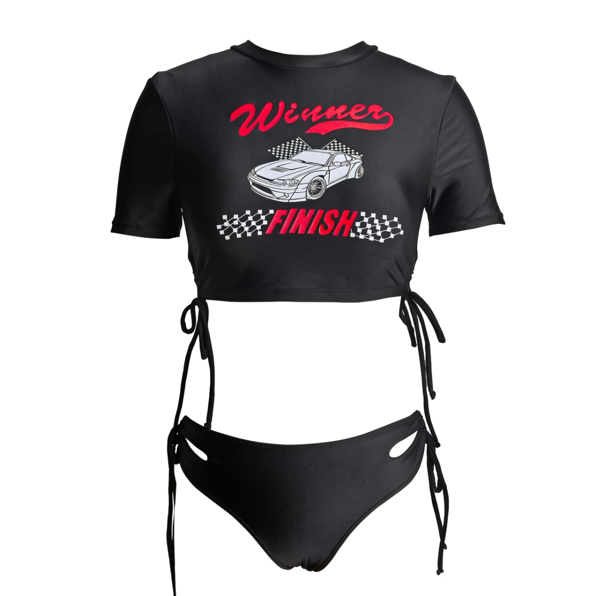 Жіночий спортивний купальник (підлітковий) 2025 — топ-футболка з принтом і чашечками + плавки на зав’язках