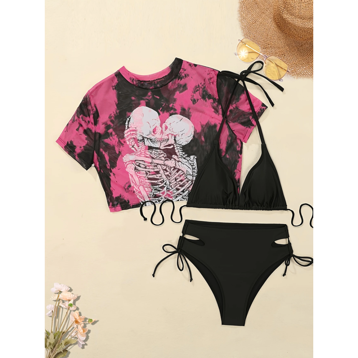 Жіночий купальник 2025 — ліф і плавки на зав’язках + сітчастий топ-футболка з малюнком