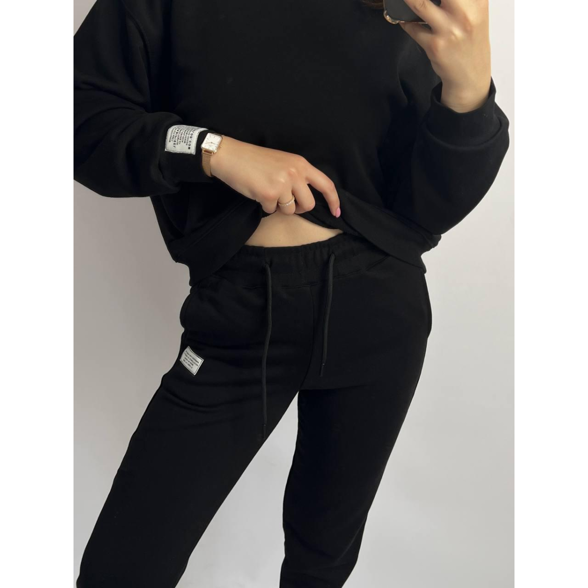 Штани з широкою резинкою та шнурком забезпечують комфортну фіксацію на талії, а манжети на світшоті додають акуратності образу.