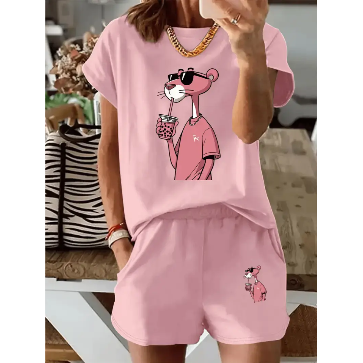 Оригінальний літній костюм для жінок з якісної тканини двунитка, прикрашений яскравим принтом Pink Panther. Комплект складається зі зручної футболки з коротким рукавом і шортів з еластичною резинкою на талії. Представлений у кількох кольорах. Ідеально підходить для щоденного носіння, прогулянок, відпочинку та подорожей.