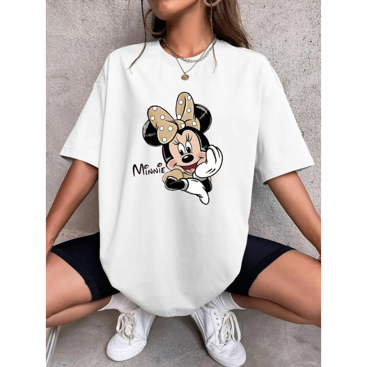 Футболка оверсайз жіноча довга з малюнком Білий, Мінні-бант, 42/44