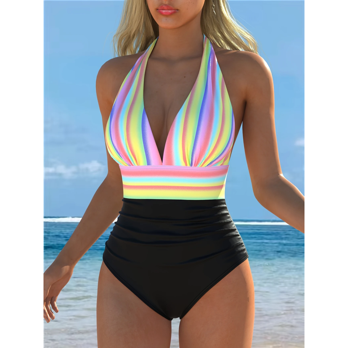Суцільний купальник із принтом та зав’язкою на шиї (plunge) Модний жіночий купальник із глибоким V-подібним вирізом. Верх прикрашений стильним неоновим принтом, що акцентує талію. Модель має зав’язку на шиї та відкриту спину — жіночно і комфортно. Низ класичного чорного кольору з високим вирізом стегна — підкреслює ноги та силует. Ідеальний варіант для відпочинку на пляжі або біля басейну. ✅ Зручна посадка ✅ Зав’язка на шиї ✅ Актуальний принт ✅ Підкреслює фігуру ✅ Швидковисихаюча тканина