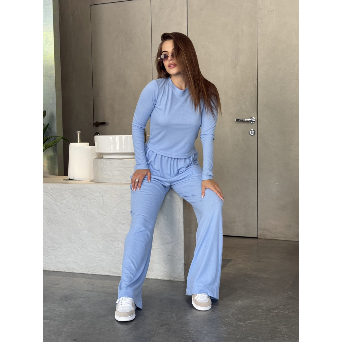 Жіночий костюм з тканини рубчик з довгим рукавом і вільними штанами