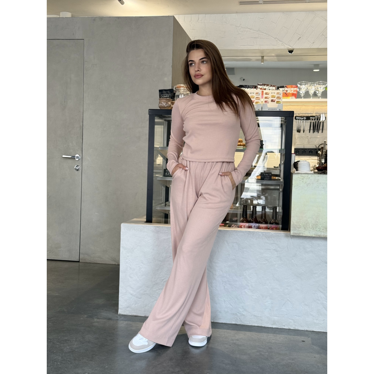 Модний і зручний жіночий костюм з високоякісного рубчика ідеально підійде для активного відпочинку та повсякденного носіння. Легка й еластична тканина не тільки комфортна в носінні, а й дає змогу шкірі дихати. У комплект входить стильний лонгслів з довгим рукавом, який не обтягує тіло, і вільні штани зі зручною посадкою, що створюють розслаблений і сучасний силует.