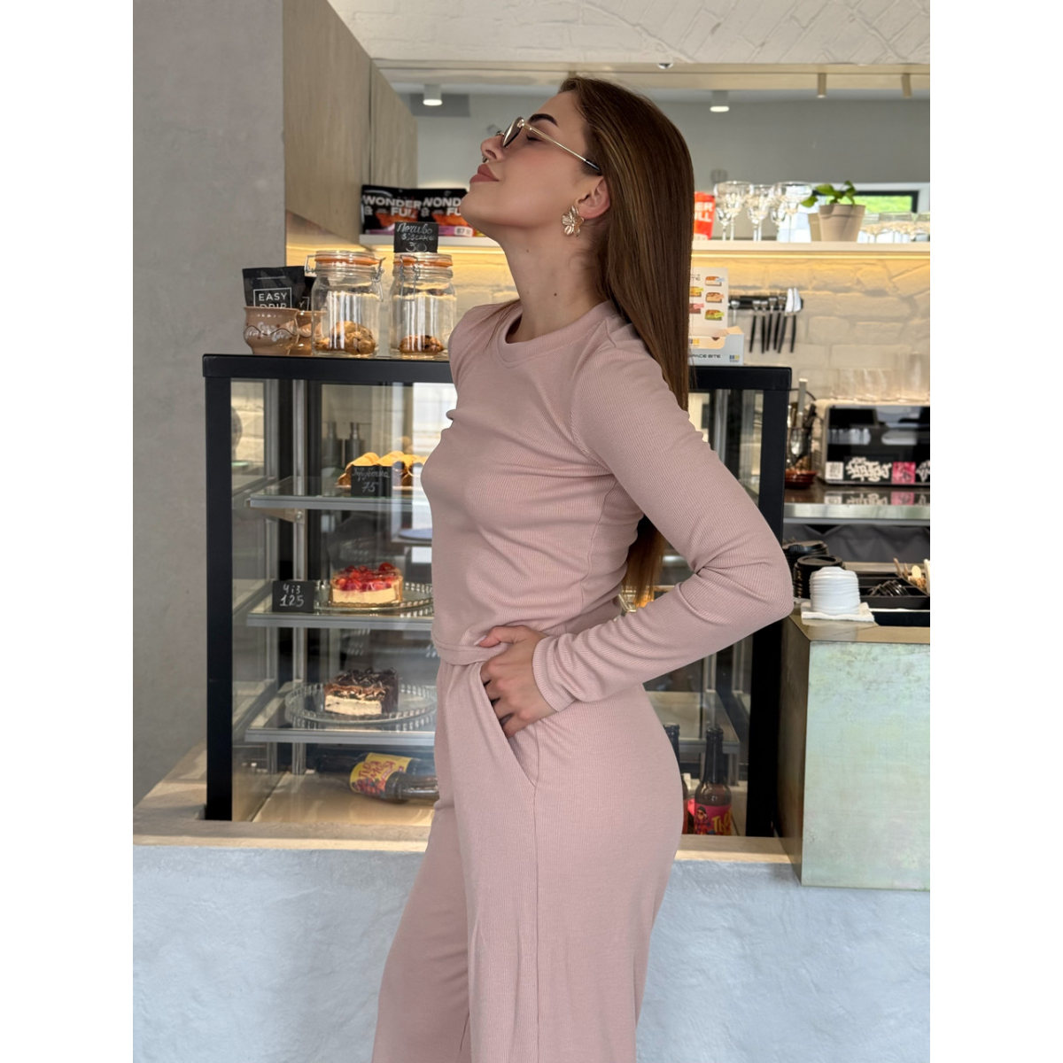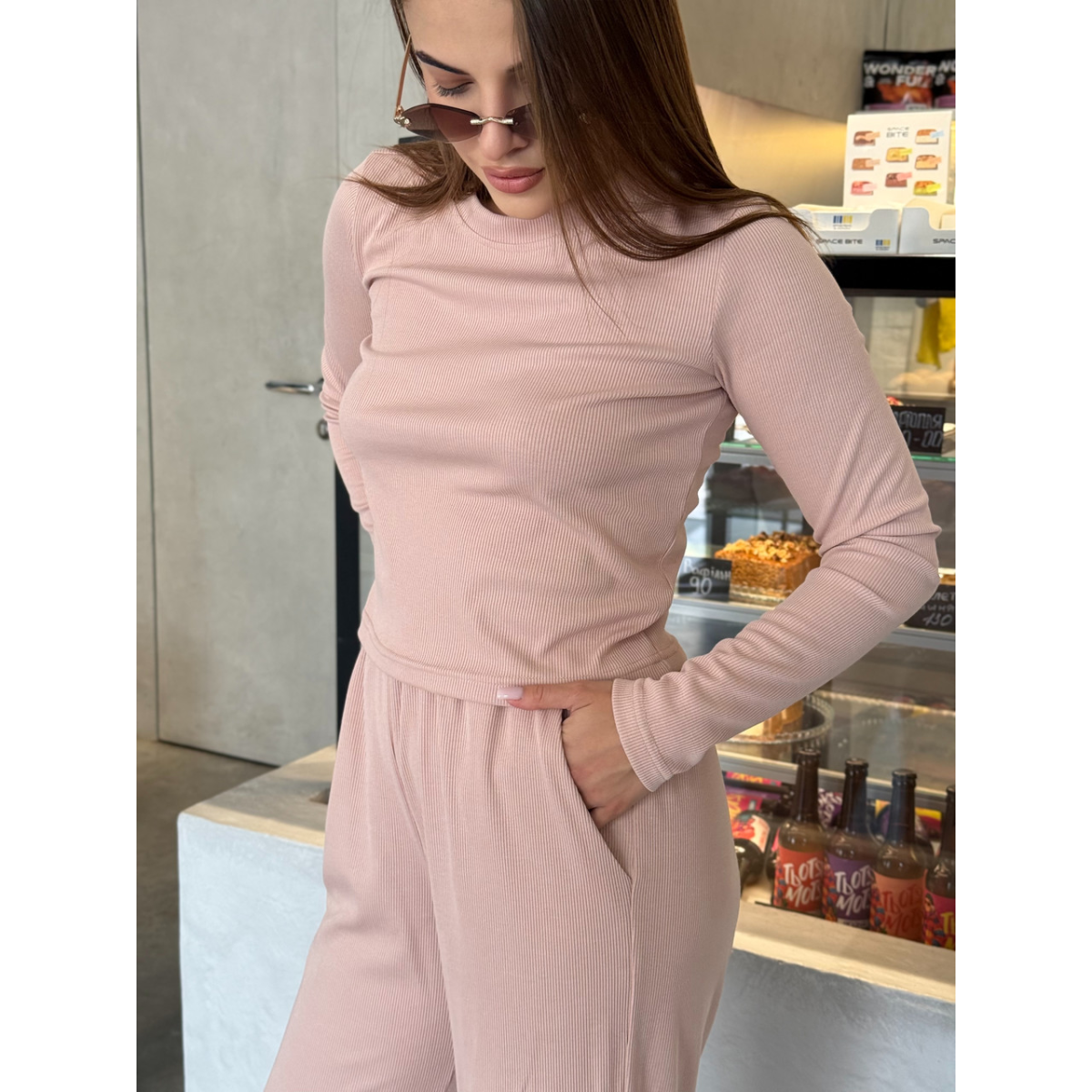 Модний і зручний жіночий костюм з високоякісного рубчика ідеально підійде для активного відпочинку та повсякденного носіння. Легка й еластична тканина не тільки комфортна в носінні, а й дає змогу шкірі дихати. У комплект входить стильний лонгслів з довгим рукавом, який не обтягує тіло, і вільні штани зі зручною посадкою, що створюють розслаблений і сучасний силует.
