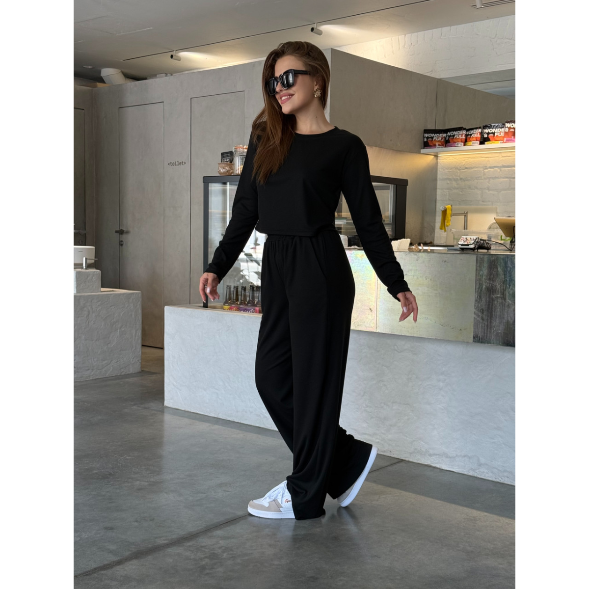 Модний і зручний жіночий костюм з високоякісного рубчика ідеально підійде для активного відпочинку та повсякденного носіння. Легка й еластична тканина не тільки комфортна в носінні, а й дає змогу шкірі дихати. У комплект входить стильний лонгслів з довгим рукавом, який не обтягує тіло, і вільні штани зі зручною посадкою, що створюють розслаблений і сучасний силует.